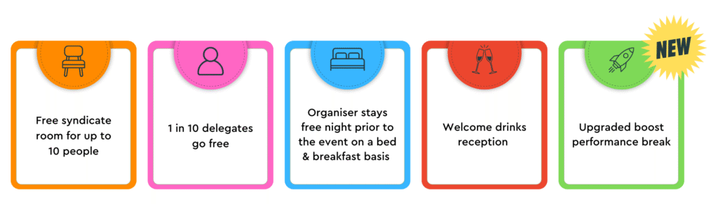 All incentives are subject to availability and must be confirmed at the time of booking. For new bookings under £1,000: choose either a free syndicate room, 1 in 10 delegates free or upgraded boost performance break. For new bookings over £5,000: choose two treats from the full list. For new bookings over £1,000: choose one treat from the full list. Valid on any new bookings made before 30th April 2026. Weddings and Christmas parties excluded. Events must take place within the promotional period. Minimum numbers apply – please ask for details. Quote “PICK” at confirmation to qualify.